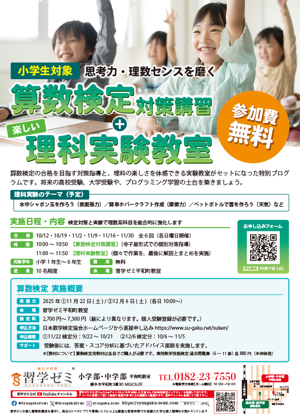 当日は理科実験教室もあわせて開催いたしますので、算数検定に挑戦したいという方は、是非ご参加ください。