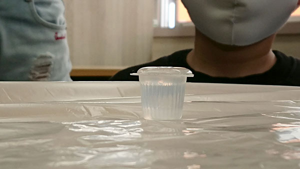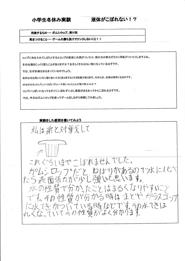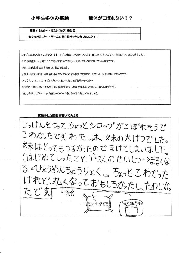 なぜ丸い粒になるのか、球状になろうとする水の性質をガムシロップを使ったで実験で学びました。