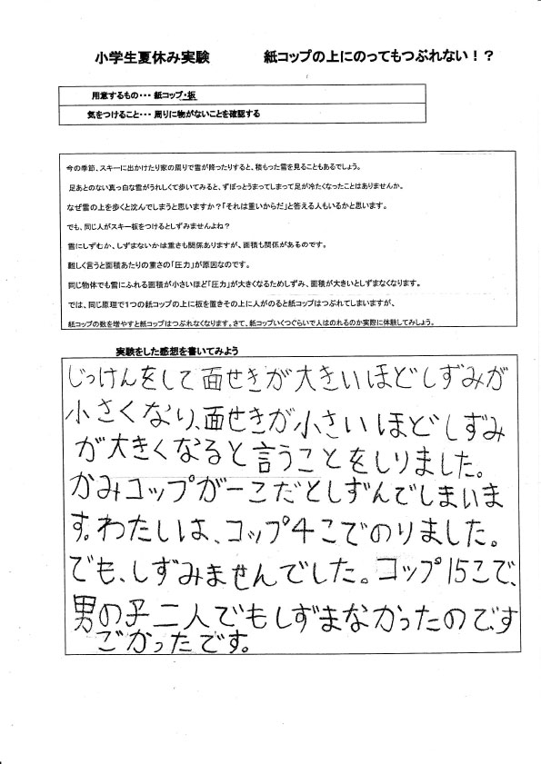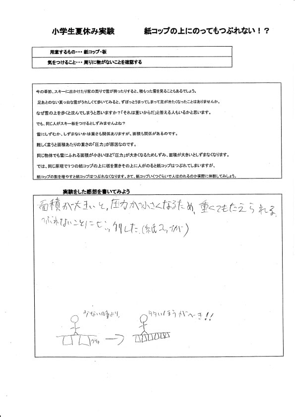 実験では、実際に紙コップの上に敷いた板の上に人が乗り、面積あたりの重さの「圧力」を学びました。