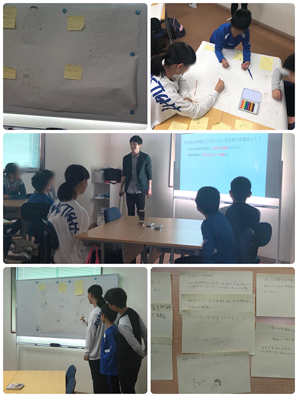 時代の変化に関するプレゼンを聞いてもらってから、「50年後の家電はどうなっている?」をテーマにグループワークを行い、最後にグループごとに発表をしてもらいました。