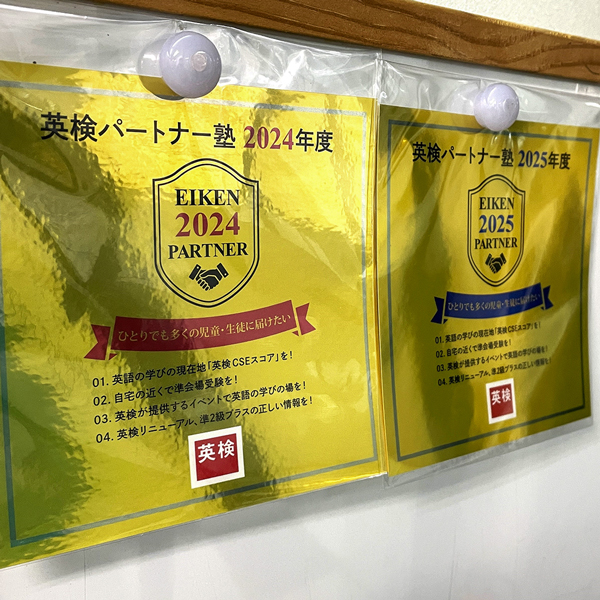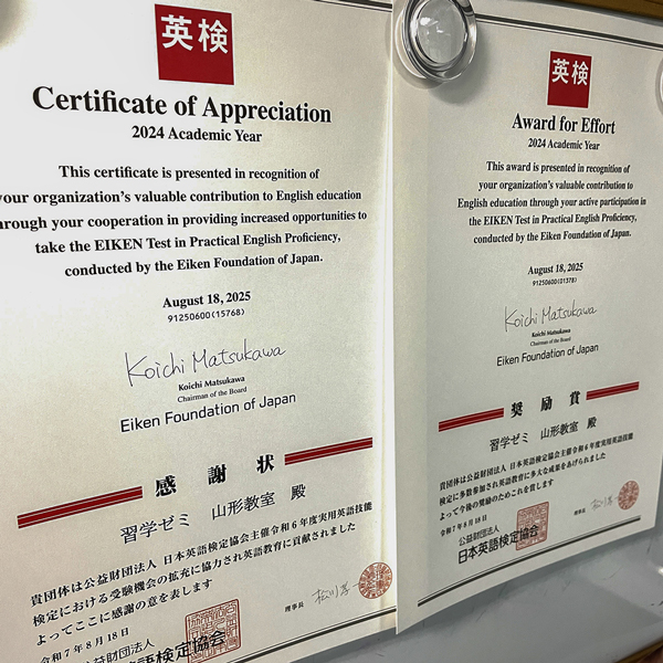 当教室では毎年欠かさず英検を実施しており、その継続的な取り組みが評価され、英検協会様より感謝状をいただいております。